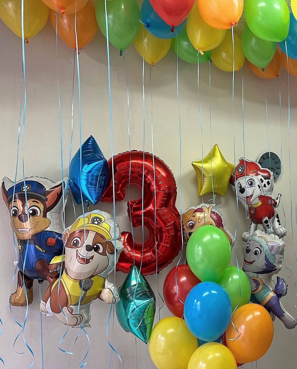 Композиция объединяет гелевые шары, фольгированные шары и тематический шары герои Щенячий Патруль. Большая цифра 3 подчёркивает повод и делает декор заметным. Благодаря ярких оттенков набор выглядит стильно.